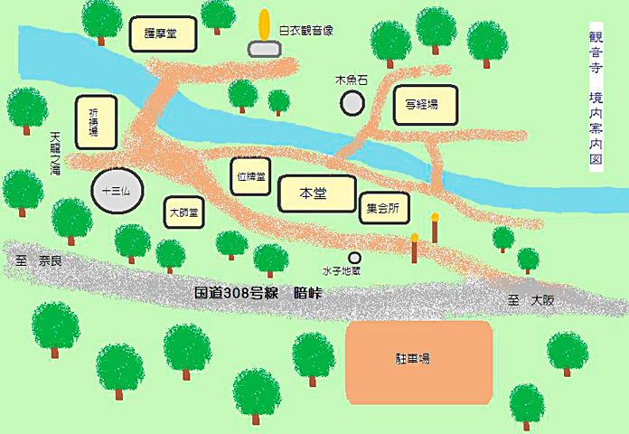 聖法山 観音寺は、生駒山中腹の大阪府東大阪市から奈良県生駒市を通る国道308号線沿いにあり、この道の県境にある峠を「暗峠(くらがりとうげ)」、そしてこの道を「暗越奈良街道(くらがりごえならかいどう)」といい、数ある奈良街道の一つで「日本の道百選」にも選定されています。またこの道は、松尾芭蕉が1694年(元禄7年)に大坂へ向かう途中に通り、「菊の香に くらがり登る 節句哉」という句を詠んでいます。当寺の境内には豊浦川が流れ、平行して旧奈良街道があります。